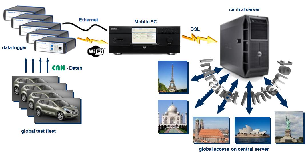 系统包括具有以太网/Wi-Fi无线网和GPS模块的记录仪,在试验场地用于调度和数据存储的移动电脑和中央服务器,通过因特网收集所有记录仪的用户数据。记录仪记录CAN数据,并通过专门的下载软件无线或有线地将数据传输到移动电脑,再从移动电脑将数据传输到中央服务器(同步进行),这些数据可以通过内网或因特网实时地在世界各地进行访问和使用。